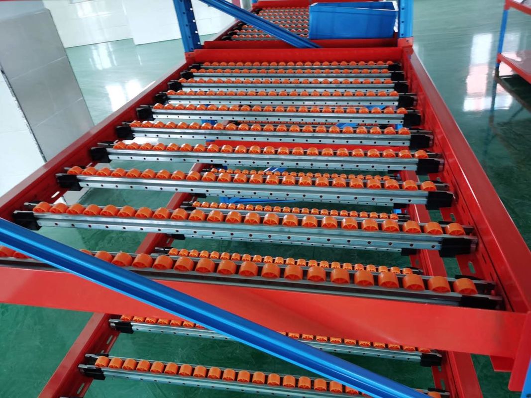 - Colocación de las mercancías sobre ruedas. Un lado para cargar, el otro lado para recoger. El lado de recogida de la estantería es más bajo que el lado de carga y las mercancías pueden deslizarse automáticamente del lado de carga al lado de recogida.